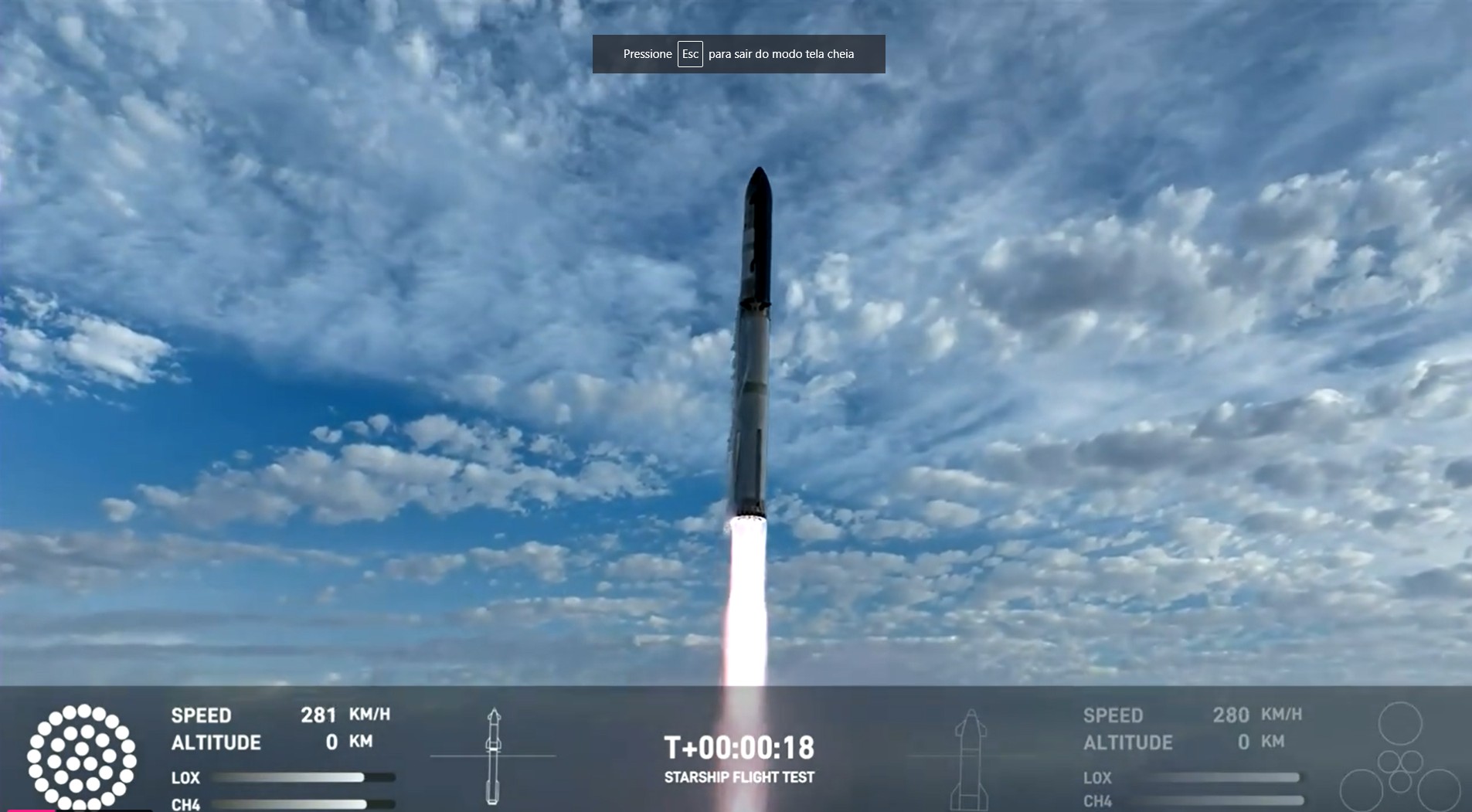 Mais uma vez, voo não tem tripulantes. Empresa do bilionário Elon Musk quer usar Starship para, no futuro, transportar pessoas e cargas em viagens para a Lua e Marte. SpaceX lança nave Starship A SpaceX, empresa do bilionário Elon Musk, lançou nesta quinta-feira (14) o terceiro voo teste da Starship, a maior nave do mundo. O lançamento ocorreu por volta das 10h25 e deve durar 1 hora. Até o momento, este é o teste mais bem sucedido da Starship. O foguete Super Heavy, que impulsionou a nave, já retornou: nos dois primeiros testes, em 2023, ele explodiu. A SpaceX fez fama por criar propulsores reutilizáveis. ACOMPANHE AO VIVO Segundo a empresa, o Super Heavy caiu no mar, no Golfo do México, como previsto. No entanto, a empresa não transmitiu esse momento, por isso, não dá para confirmar o sucesso do pouso. Enquanto isso, a nave seguia sua trajetória, que deve durar cerca de 1 hora até ela retornar. A previsão é que ela caia no Oceano Índico. Imagem do lançamento da Starship. Reprodução O lançamento atrasou porque a equipe teve que retirar algumas embarcações que estavam paradas no Golfo do México. O novo teste acontece quatro meses após a segunda tentativa. Os outros dois experimentos acabaram com explosões dos foguetes poucos minutos após a decolagem (relembre as missões abaixo). Além disso, mais cedo, o tempo nublado e as condições de vento também preocuparam a equipe da SpaceX. Imagem da Starship sendo lançada. Reprodução Abaixo veja o momento em que a nave se separou do foguete Super Heavy, que caiu no mar, como é o esperado. Imagem do propulsor desacoplando Reprodução O que deu errado nos outros testes? Os outros lançamentos acabaram com explosões em momentos diferentes de missão. Na primeira tentativa, em abril de 2023, uma falha fez os motores se desligarem e forçou a empresa a acionar um sistema de destruição para explodir o propulsor, quando ele ainda estava acoplado à cápsula. Veja como foi o 1º lançamento da Starship No segundo teste, em novembro de 2023, o propulsor explodiu depois de se separar da Starship. A SpaceX também perdeu contato com a cápsula, a parte superior da nave. Em fevereiro, a empresa identificou a necessidade de 17 ações corretivas após achar uma falha num filtro que alimenta os motores. "A SpaceX implementou mudanças de hardware nos próximos veículos Starship para melhorar a redução de vazamentos, proteção contra incêndio e operações refinadas associadas à ventilação do propelente para aumentar a confiabilidade", disse a fabricante. Veja como foi o 2º lançamento da Starship Por que o voo é importante? A Starship será usada para realizar voos de carga no programa Artemis, uma série de missões que a Nasa, a agência espacial americana, planeja para levar humanos de volta à Lua. Os planos para a Starship também incluem dois voos que levarão artistas ao redor da Lua em voos com cerca de uma semana de duração cada um. Um deles levará o bilionário japonês Yusaku Maezawa e artistas convidados por ele, e o outro tem como primeiros passageiros o empresário americano e primeiro turista espacial do mundo Dennis Tito e sua esposa Akiko Tito. Conheça o maior foguete da história, criado pela empresa de Elon Musk Como é a nave Starship? Tem 120 metros de altura (somando nave Starship e propulsor Super Heavy) e 9 metros de diâmetro Poderá transportar até 100 pessoas É projetada para ser reutilizável, assim como outras naves da SpaceX Tem capacidade para transportar até 250 toneladas, se puder ser descartada após uma missão, e 150 toneladas, quando precisar ser reutilizada Está sendo testada desde 2019 (sem o propulsor Super Heavy), mas o primeiro pouso bem-sucedido só aconteceu em 2021 Será usada na missão Artemis 3, da Nasa, que levará astronautas de volta à superfície da Lua, em 2025 Suas três primeiras missões tripuladas deverão ser feitas com turistas espaciais, sendo que duas delas darão uma volta na Lua No futuro, poderá ser usada para transportar pessoas e cargas até Marte, segundo a SpaceX Conheça a Starship, nave que a SpaceX usará em voos ao redor da Lua Starship Arte/ g1